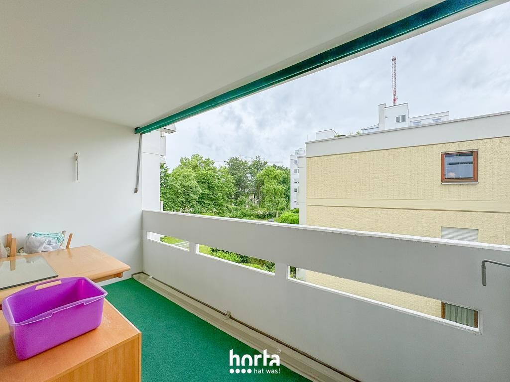 Das gegenüberliegende Wohnzimmer beeindruckt durch eine große Fensterfront, die für viel Tageslicht sorgt. Eine Glastür führt auf den großzügigen Balkon mit Blick in den liebevoll begrünten Innenhof – ein perfekter Ort zum Entspannen. Praktischer Stauraum ist durch Einbauschränke vorhanden.
