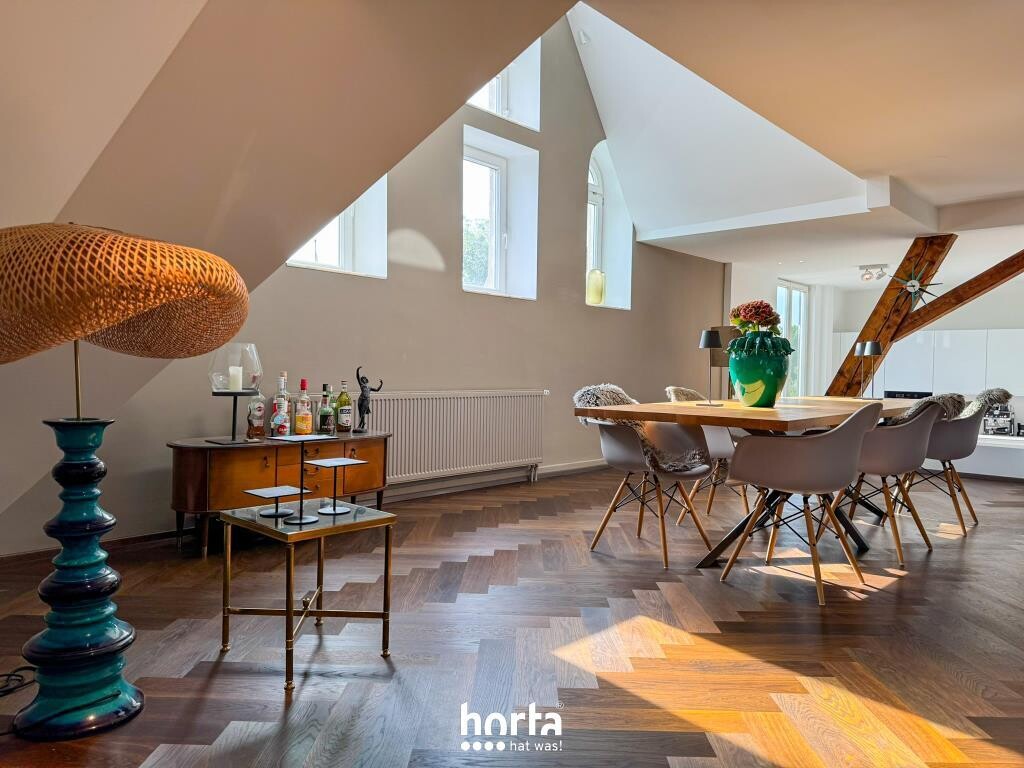 Die hochwertig sanierte 4,5-Zimmer-Maisonettewohnung präsentiert sich auf 216 m² Wohnfläche als außergewöhnliches Wohnjuwel, das auf eindrucksvolle Weise historischen Altbaucharme mit modernem Wohnkomfort verbindet. Bereits beim Betreten eröffnet sich der großzügige, offene Grundriss: Der Blick fällt direkt in den weitläufigen Wohn- und Essbereich, während linkerhand ein stilvolles Gäste-WC und gegenüberliegend die hochwertige, offene Hochglanz-Einbauküche mit Geräten von Miele und Bora zum Verweilen und Genießen einladen. [...]